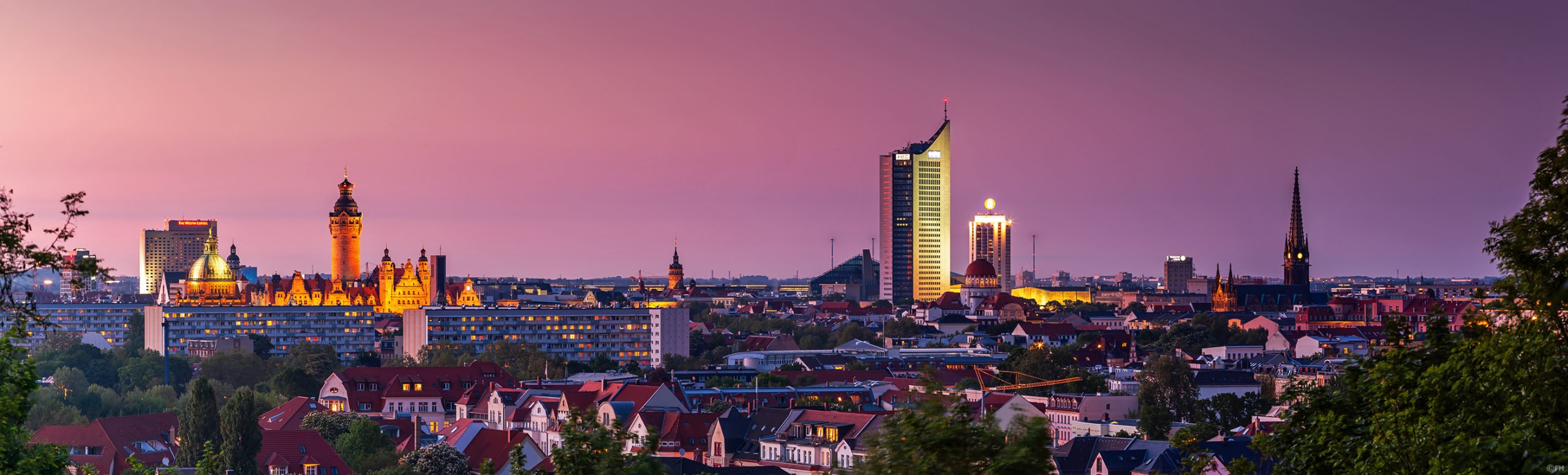 Die Leipziger CIty Skyline im Panoramablick vom Fockeberg, dem höchsten Berg in der Stadt.